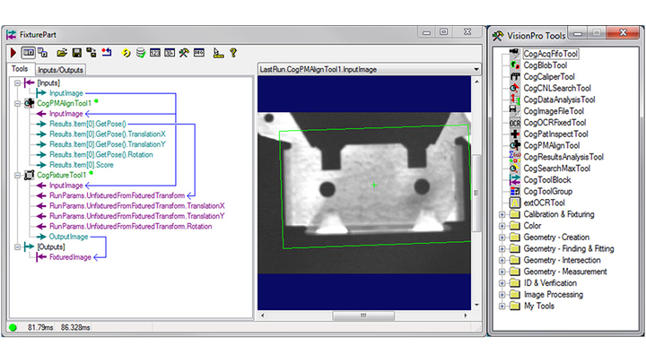 使用 VisionPro,使用者可存取圖案匹配,Blob,制動鉗,邊定位,圖像篩檢,OCR 及 OCV 視覺工具的工具庫,還可以讀取一維條碼和二維碼,執行從檢測到識別和測量的多種不同功能。VisionPro 軟體可與龐大的 .NET 類別程式庫與使用者控制完全整合。